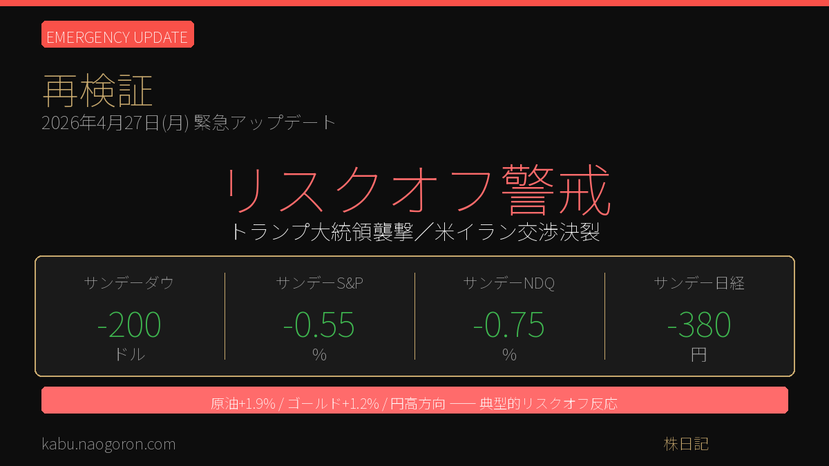 日本時間4月26日(日)午前、米ホワイトハウス記者協会主催晩餐会(WHCD)の会場で銃撃事件が発生。トランプ大統領は無事に退避したものの、容疑者は複数の武器で武装し、トランプ政権関係者を狙ったと供述しているとされ、米国内政の不安定化リスクが一気に意識される展開となりました。週末取引のサンデーダウは▲200ドル安、サンデー原油は+1.9%急騰と典型的な「リスクオフ反応」を示し、CME円建て日経先物も金曜大証終値を割り込む水準まで売られました。週明け4/27(月)の東京市場は、当初想定していた「6万円トライ・買い先行」シナリオから一転、リスクオフ警戒モードでスタートする公算が高まっています。