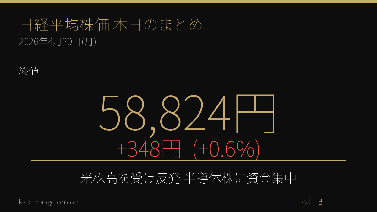 | 日経平均株価 | 58,824円 | +348円 | +0.60% |