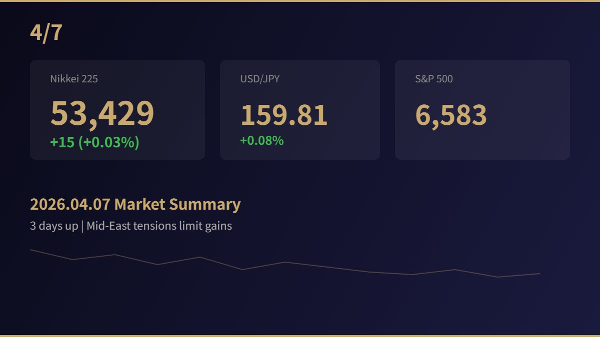 明日8日の東京市場は、トランプ大統領が設定したイランに対する期限(日本時間8日午前9時)を迎えることから、波乱含みの展開が予想されます。中東情勢の行方次第では大きな価格変動が起こる可能性があり、リスク管理には十分な注意が必要です。また、為替市場でのドル円の動向も株価に影響を与える重要な要素となるでしょう。