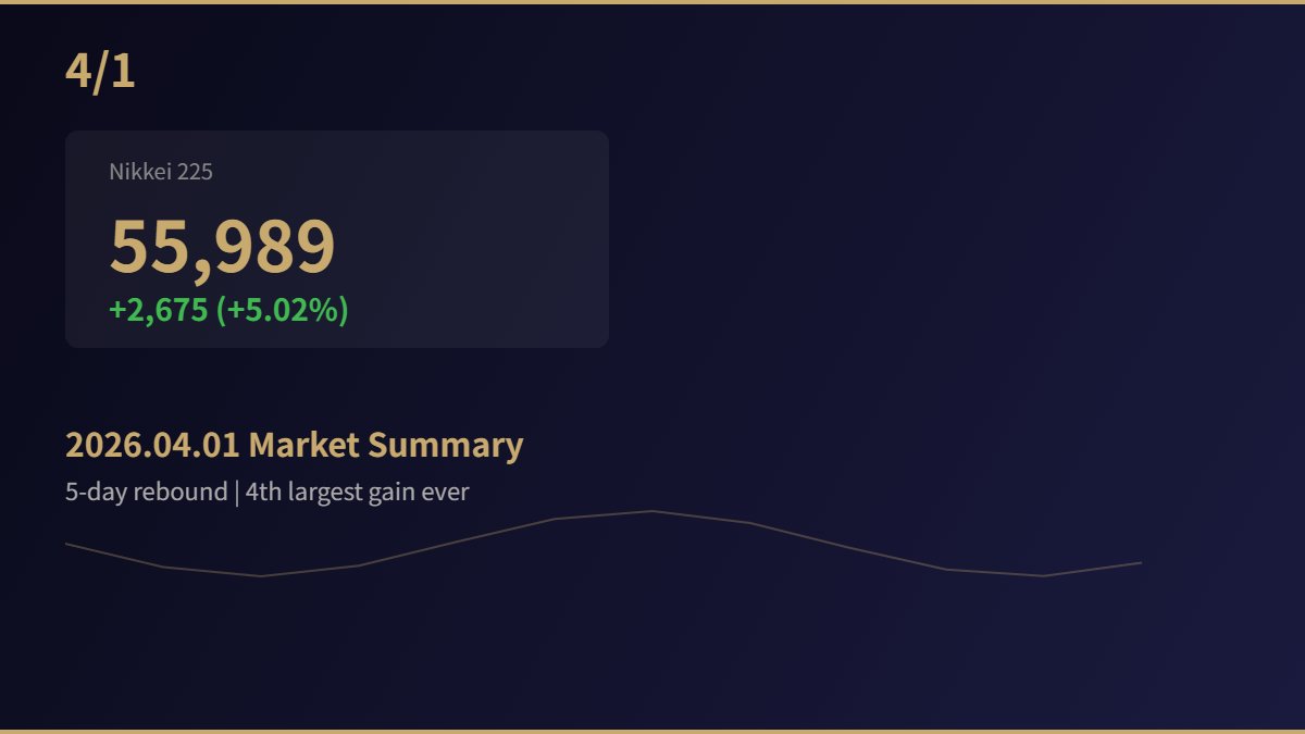 4月1日(水)、新年度入り初日の東京市場は5日ぶりの大幅反発!日経平均の終値は前日比+2,675円96銭(+5.24%)の53,739円68銭。上げ幅は歴代4位に相当する歴史的な1日となった。3月末にトランプ大統領がイランとの外交的解決への用意を示したことで市場のリスク回避ムードが急速に後退、前日のNYダウ+1,125ドル大幅高を引き継いで東京市場でも売り方の買い戻しが殺到した。新年度初日にして3月の傷跡を一気に埋めにかかった格好だ。